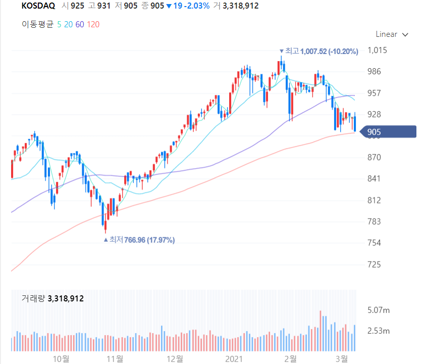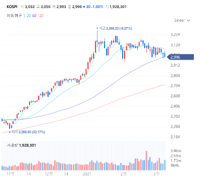 시장이 금리에 민감하게 반응하고 있다. 백신보급 또한 지지부진하다. 국채금리 상승 소식에 전세계 시장은 파도타기를 하고, 설비투자가 어려워진다는 소식에 나스닥도 하락했다. 세계장이 분위기가 안좋다.