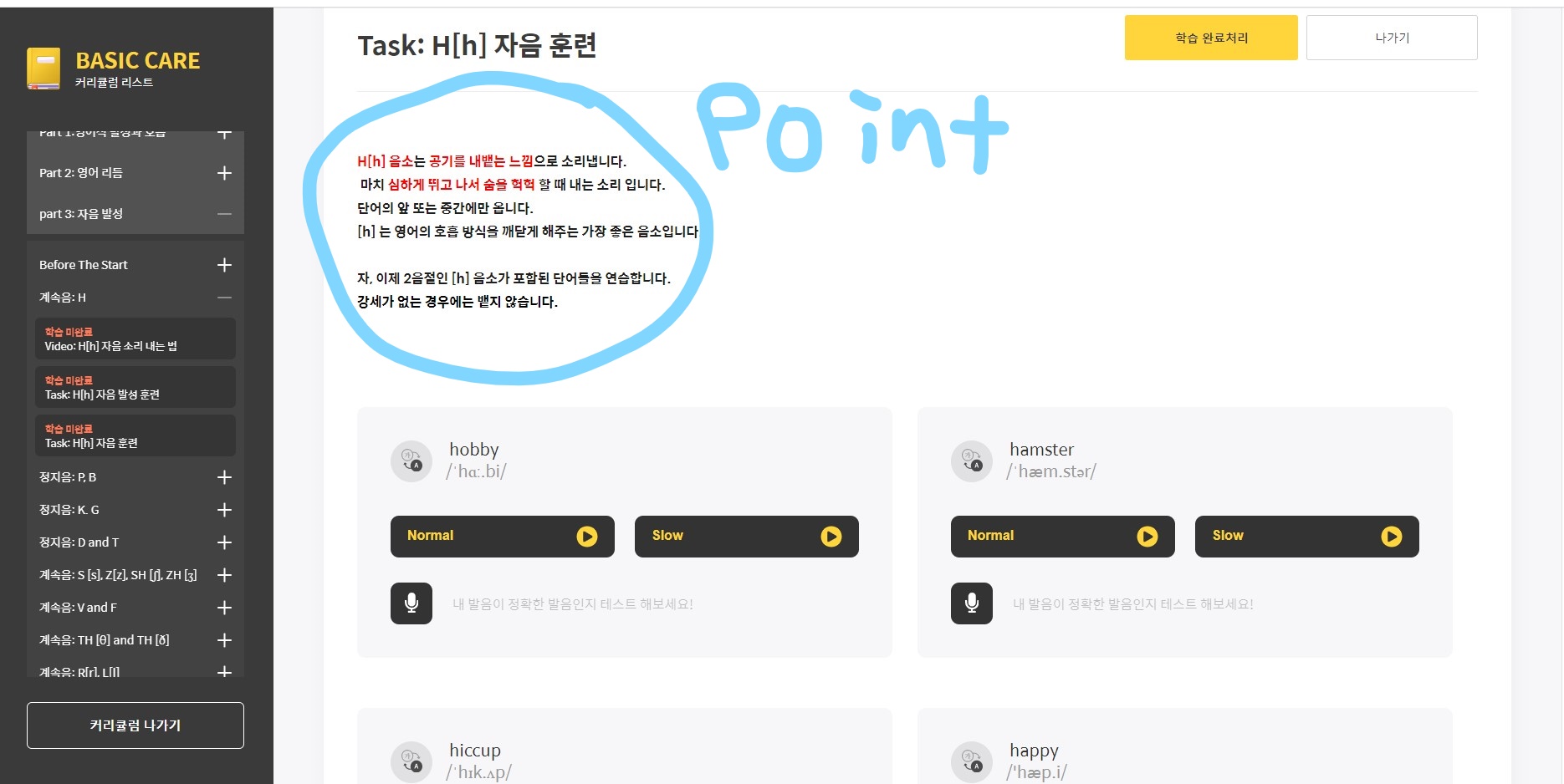 소리 훈련을 단어만 나열되고 하는게 아니라, 소리 내는 법을 친절하게 설명해준답니다.