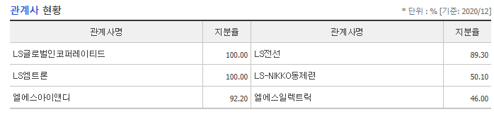 2011년 11월 4일 원자재 통합 구매 및 그룹 Shared Service 업무를 주력으로 하는 LS글로벌을 자회사로 편입하고, 2013년 12월 31일 LS전선(주)에서 인적분할된 신설법인인 LS아이앤디(주)를 같은 날 자회사로 편입하였다.