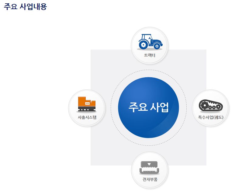 트랙터, 사출시스템, 전차 또는 장갑차 등의 궤도, 스마트폰 또는 태블릿 등의 커넥터나 안테나, FPD(Flat Panel Display)등의 산업을 영위하고 있다.