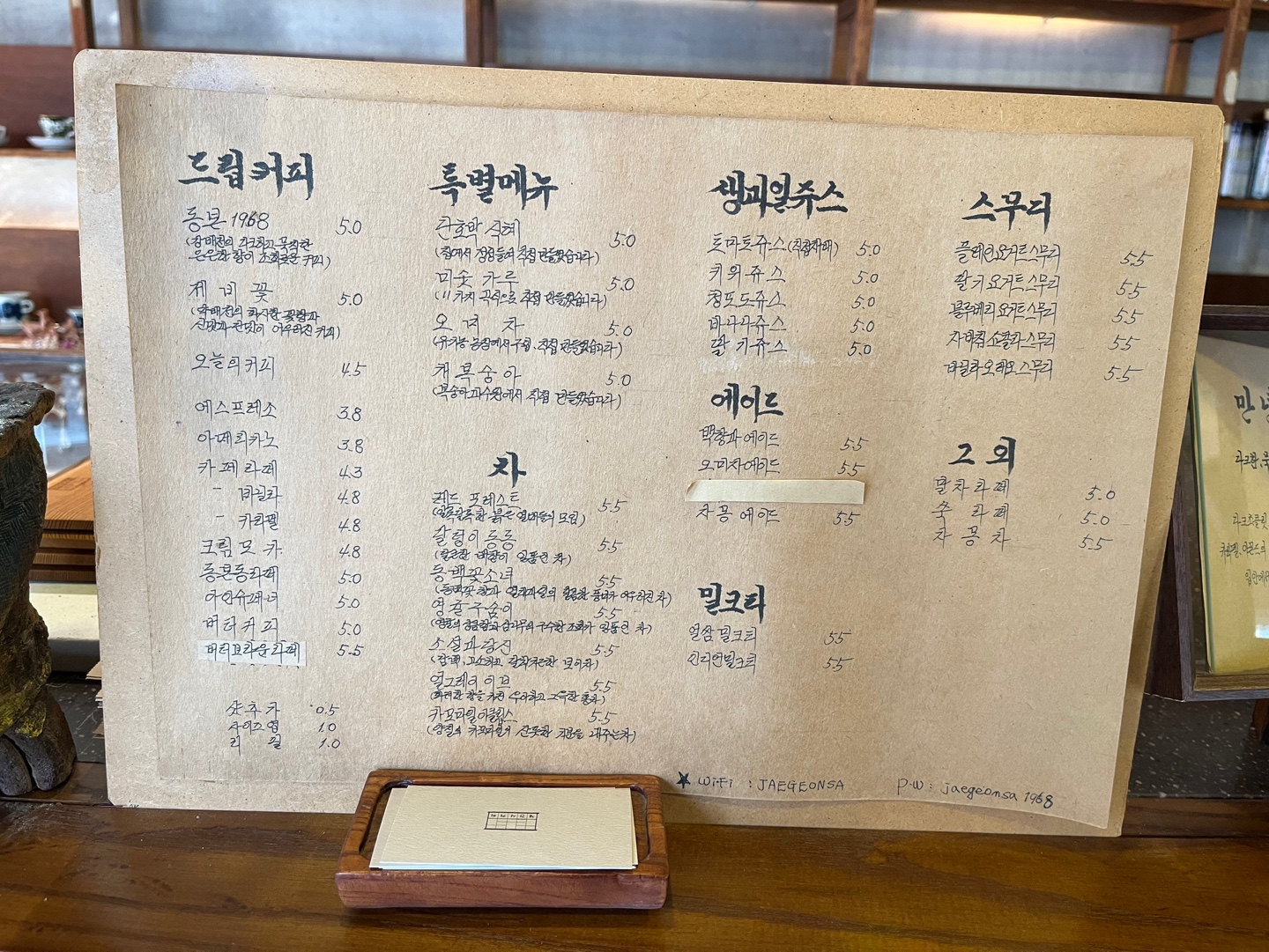 커피의 독특한 이름과 특별메뉴가 재건사 커피의 시그니처 분위기를 잘 설명해주는 것 같다.