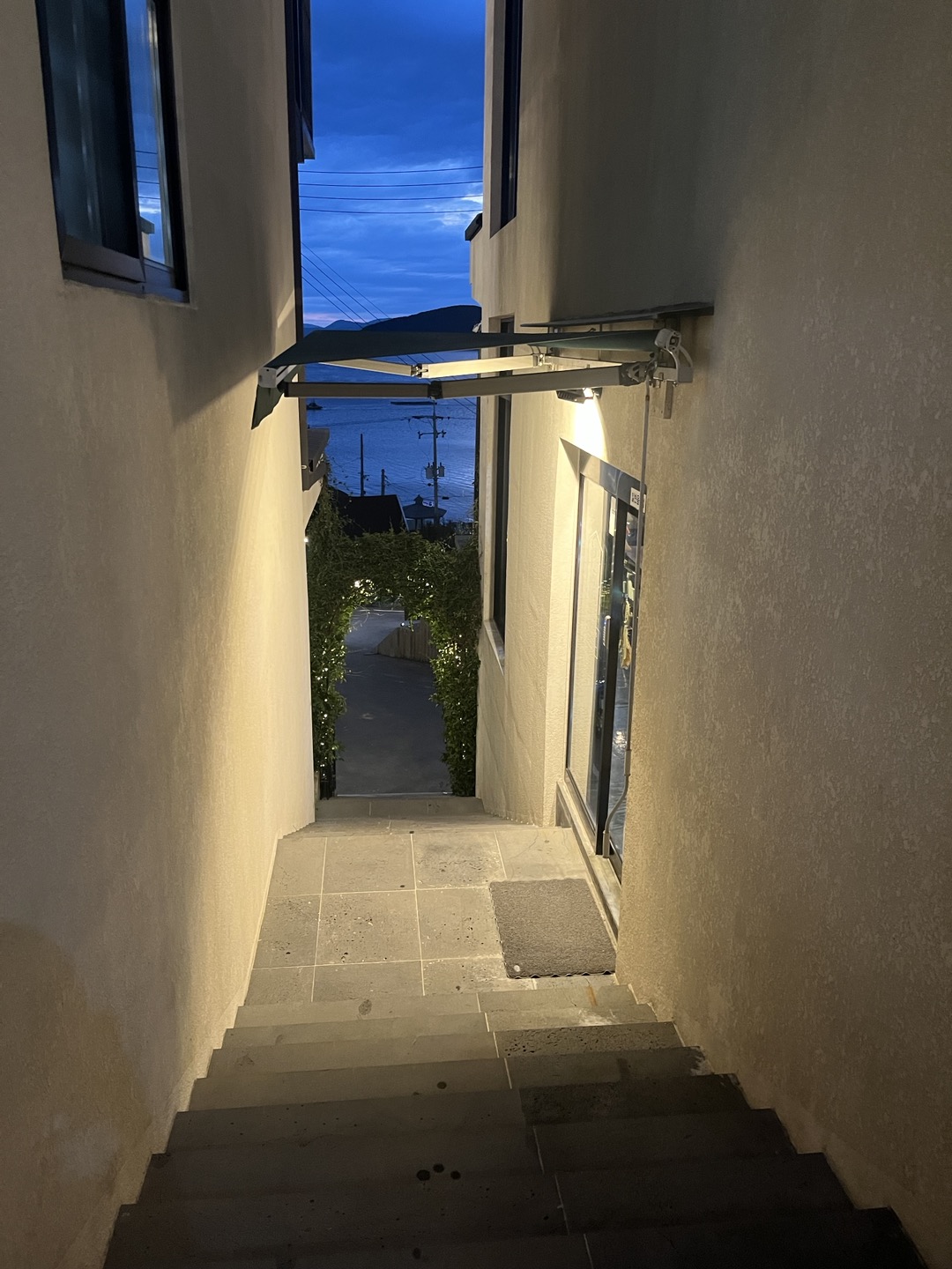 오른쪽이 카페 입구이다. 카페에 들어가기 전에 계단을 더 올라와서 바다뷰를 찍었다.