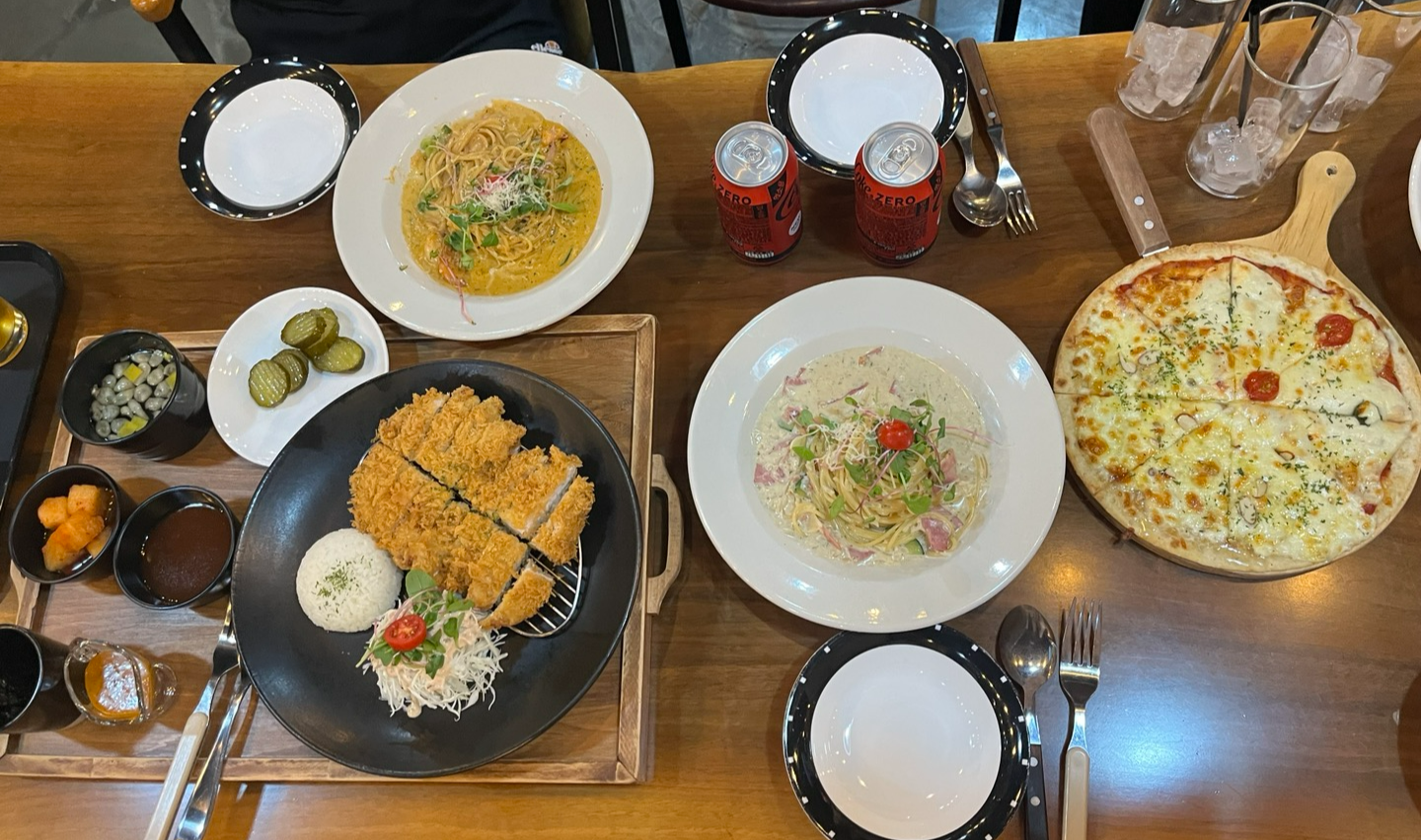[성게소스돈까스, 새우오이스터파스타,까르보나라,고르곤졸라피자, 목살필라프]를 주문하였다.