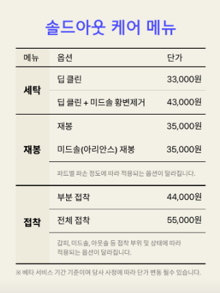 딥클린, 미드솔 제거, 재봉, 접착 등의 서비스를 받을 수 있다.
