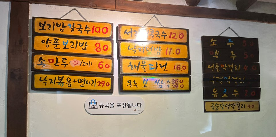 콩국수, 보리밥, 손칼국수, 해물파전, 낙지덮밥 등을 판매한다.