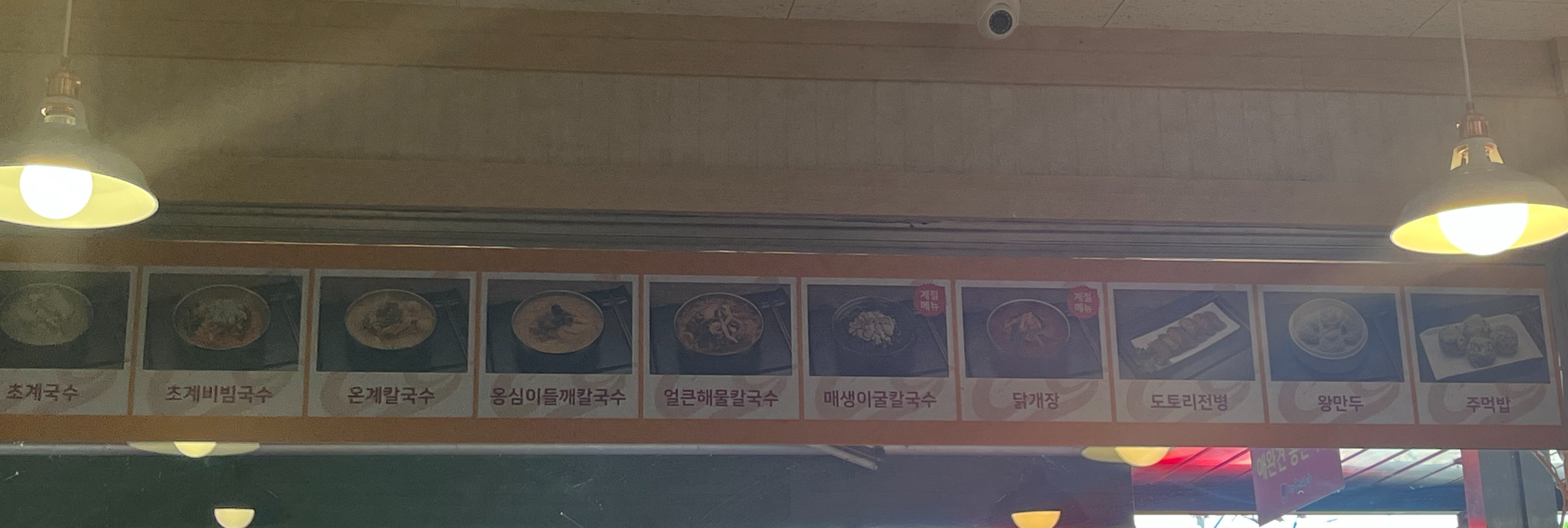 얼큰해물칼국수, 매생이굴칼국수, 닭개장, 도토이 전병, 왕만두, 주먹밥