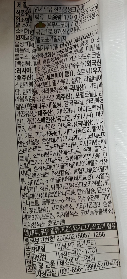 ↑ ↑ ↑ ↑ 연세우유 한라봉 생크림빵 영양성분이다.