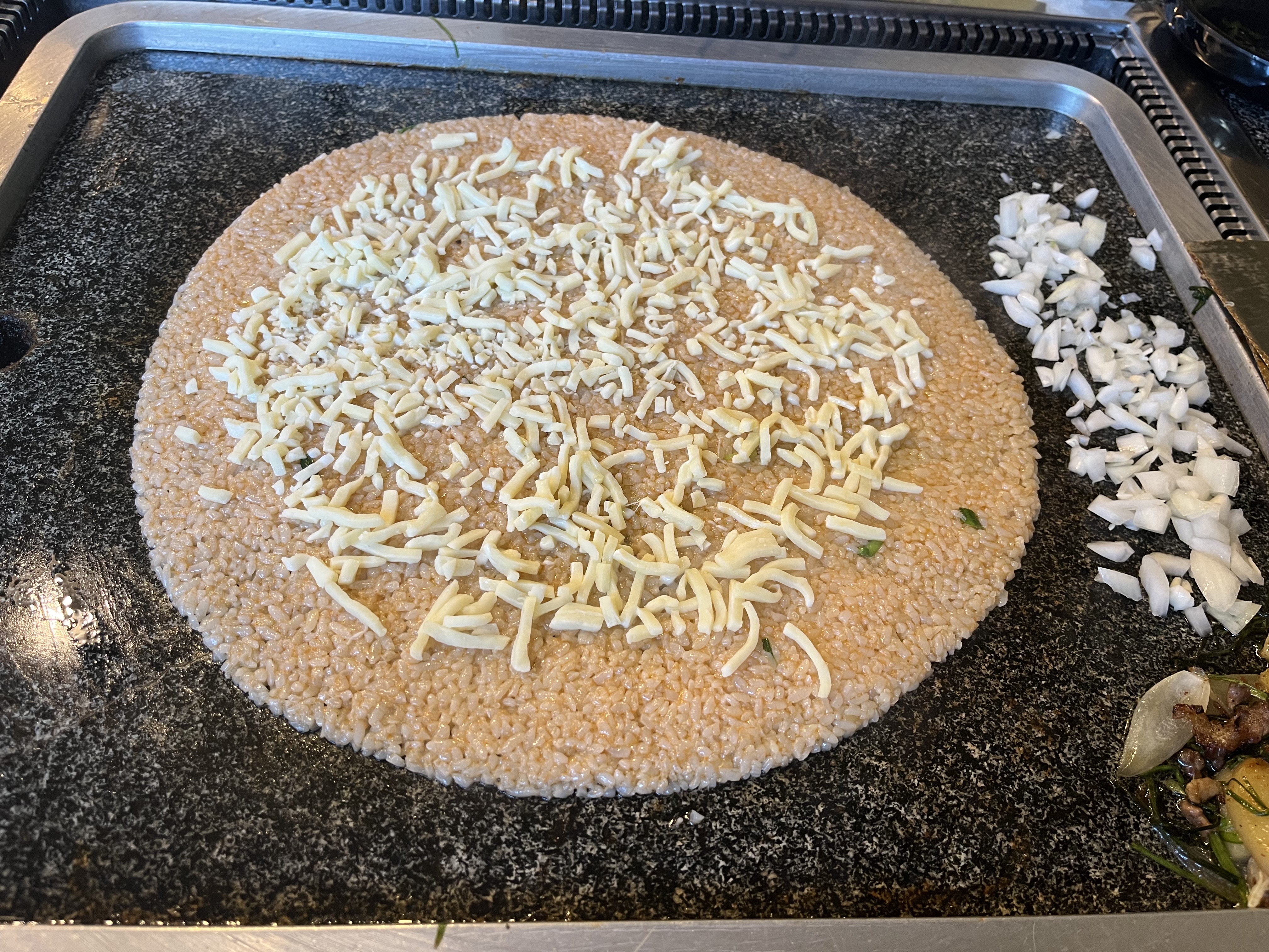 양념이 된 밥을 펴놓고 치즈를 뿌리고, 그위에 남은 오리구이재료와 양파를 올린다.