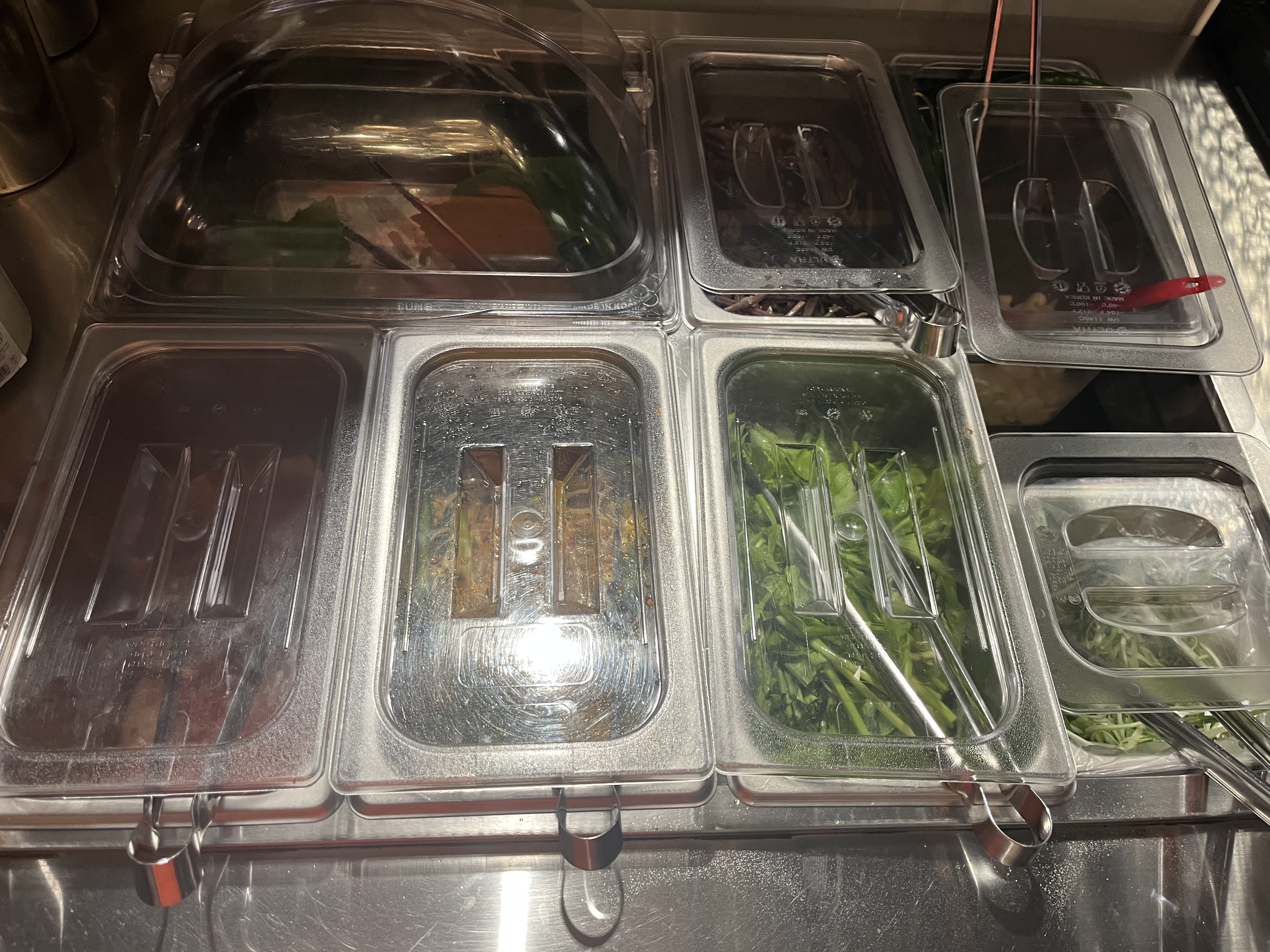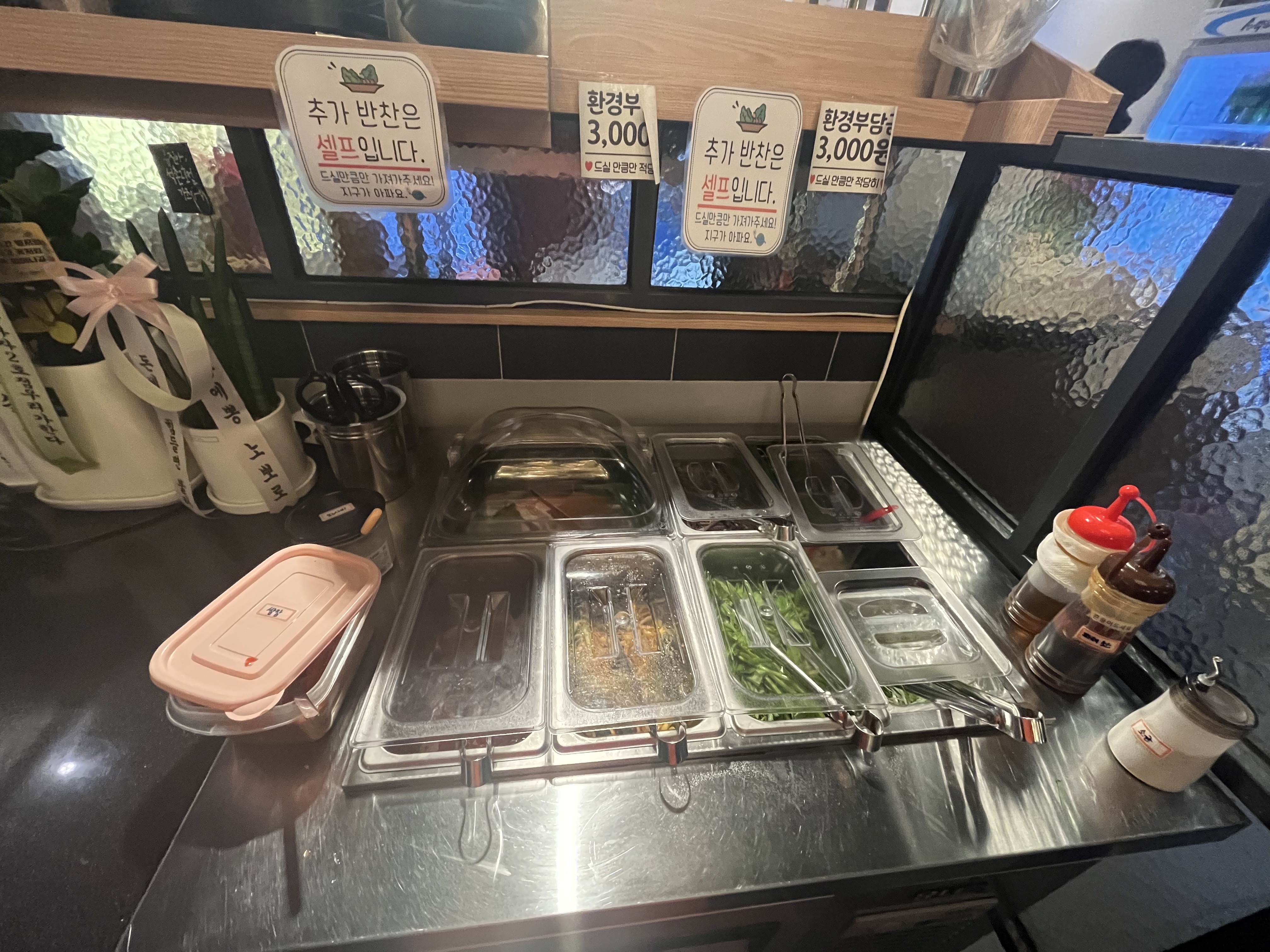 솥뚜껑에 올라가 구워지는 미나리도 셀프바에 있었다!