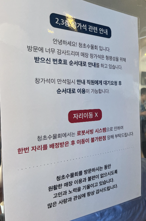 속초 청초수물회는 사람과 로봇이 같이 서빙을 하는 곳 이었습니다. 주문 받고 치우는 것은 사람이 하고 서빙은 로봇이 주로하나 시간이 나면 종업원도 서빙을 도와주는 형식으로 되어있었습니다. 오래된 맛집인 만큼 주문을 받고 치우고 서빙하는 것이 매우 빠르고 체계적이었습니다.