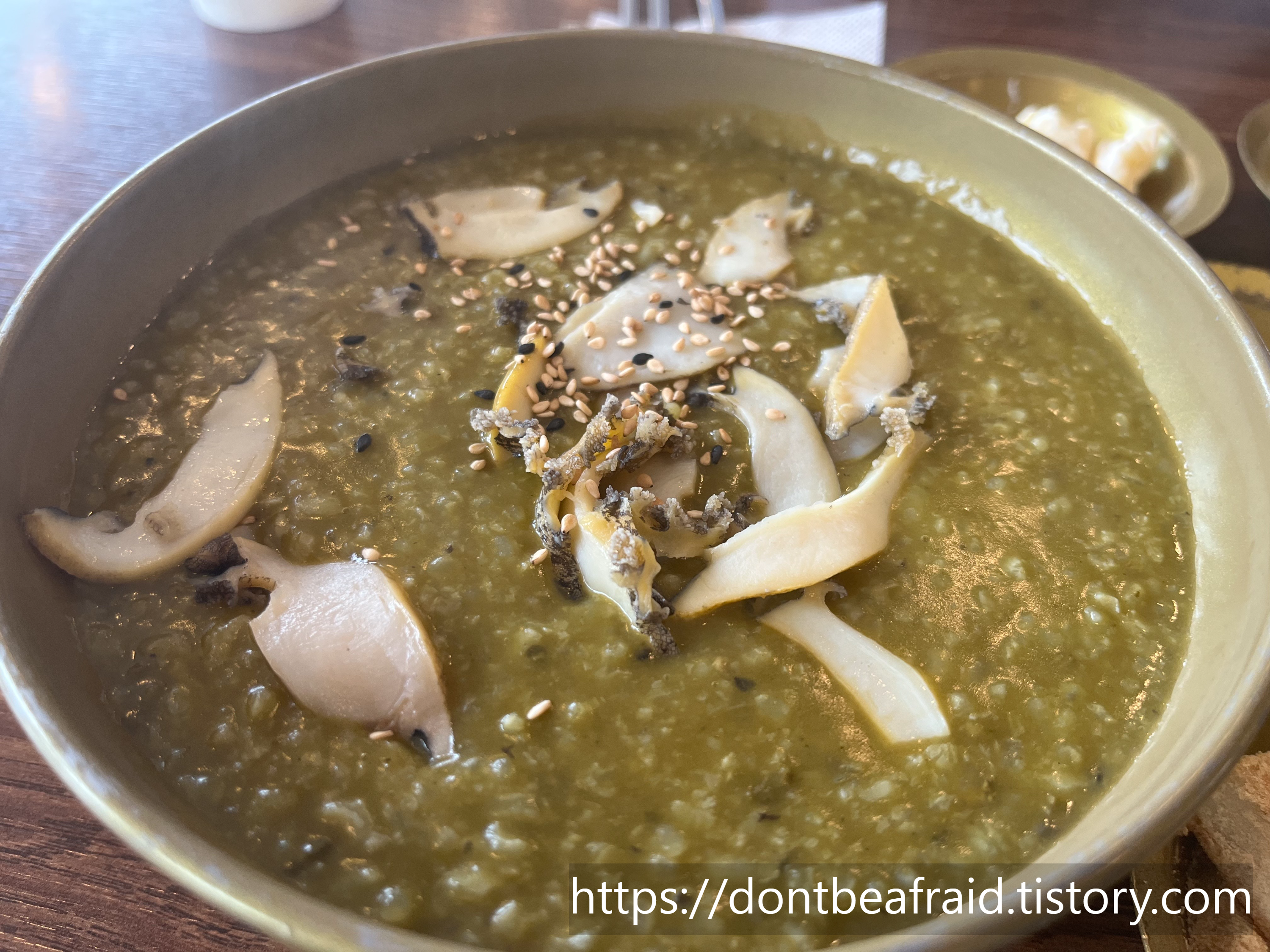 보양 전복죽 입니다. 전복과 전복내장이 들어가 초록색을 띄는 전복죽, 표고버섯까지 들어가 영양 가득한 전복죽입니다. 얘도 그냥 후루루룩 들어가더라구요. 너무 맛있었고, 고소함과 적당한 간 이었습니다.