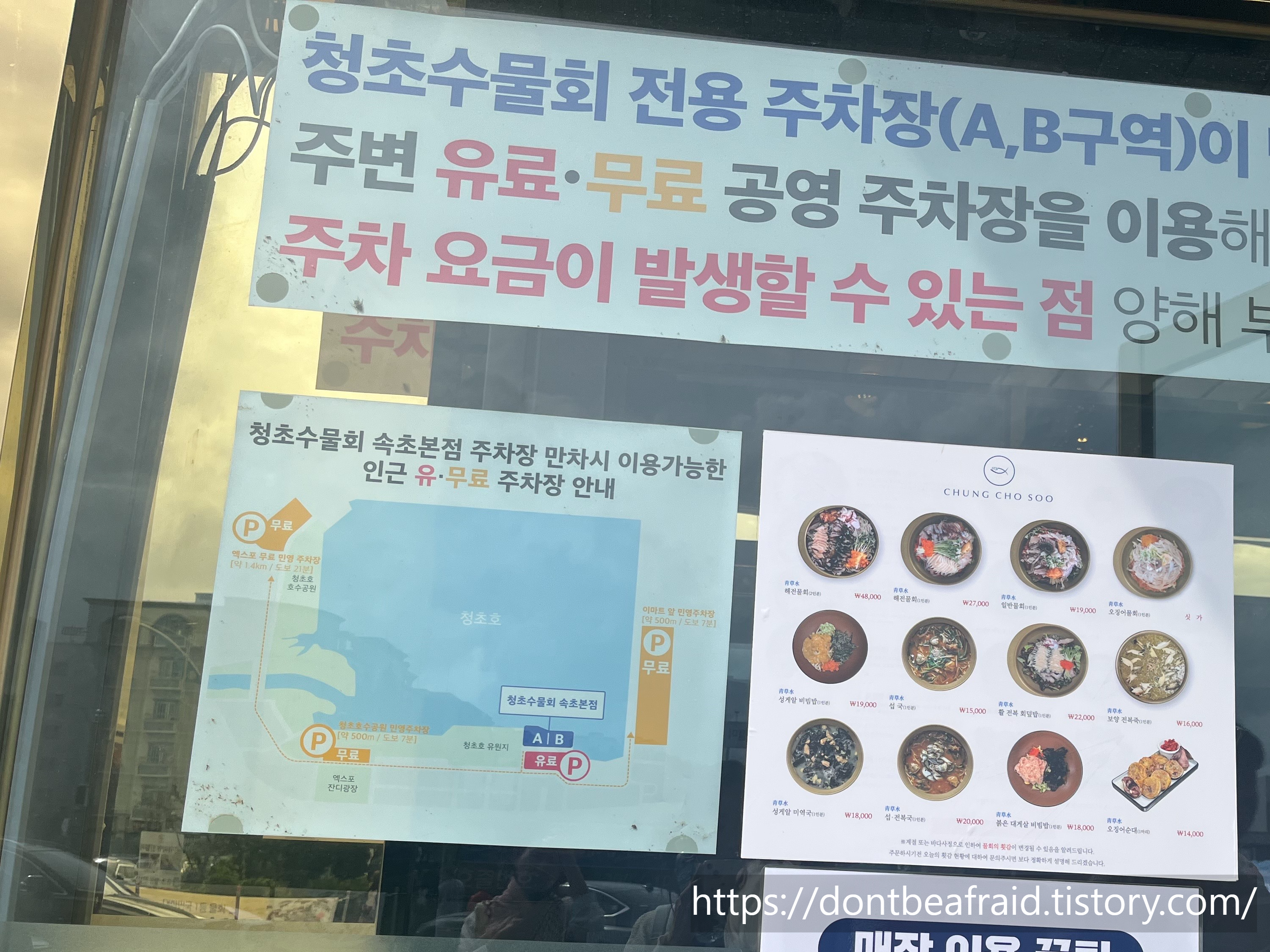 더 놀란것은 청초수물회 입구 앞에 붙어있던 안내문.. 이렇게 넓은 주차장으 가득차서 주차가 불가능 할 때가 있나봅니다.