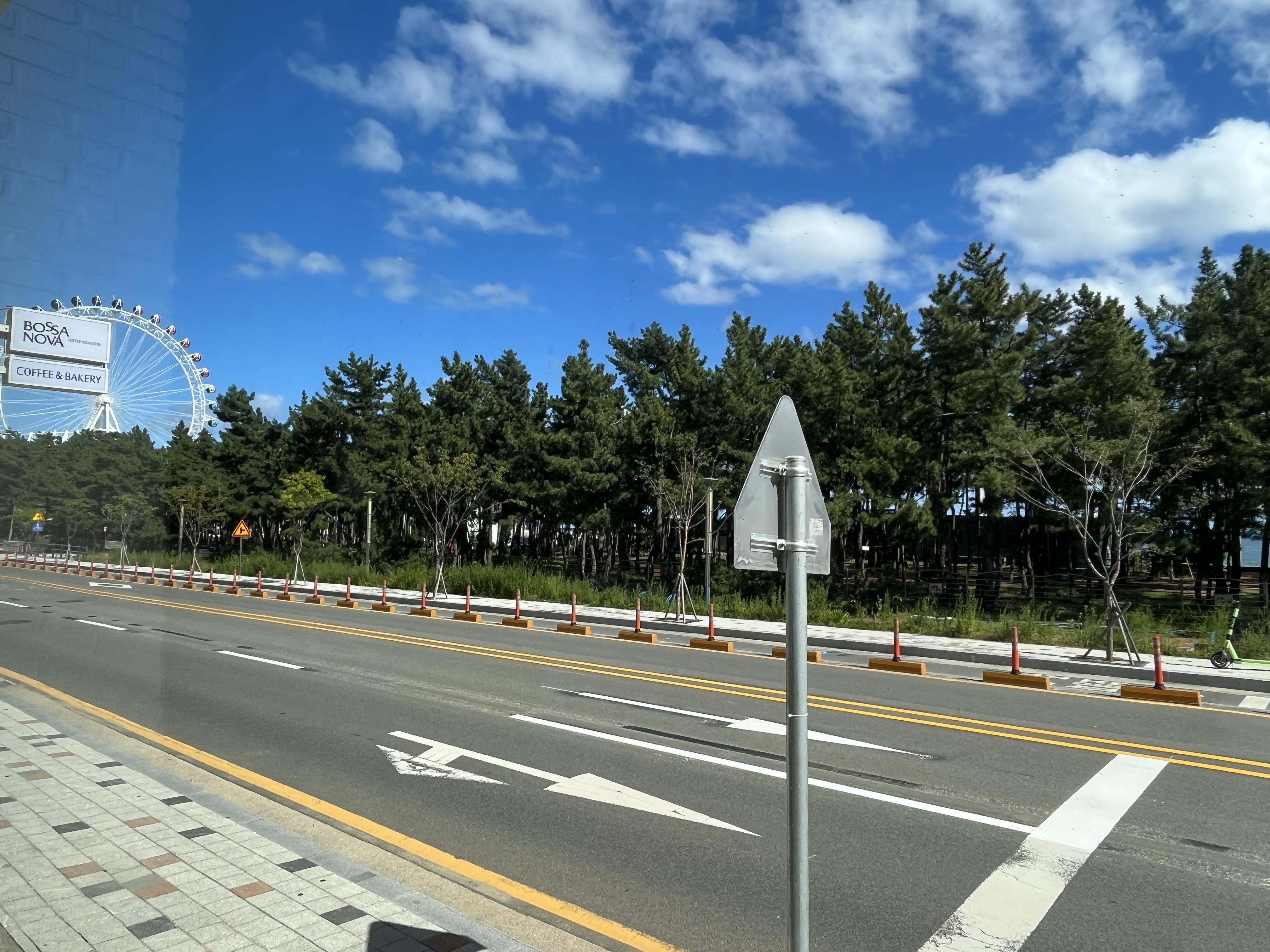 보사노바 카페의 1층은 속초 아이 대관람차가 살짝 보이는 뷰를 볼 수 있으며, 나무 사이로 슬쩍슬쩍 바다도 보입니다.