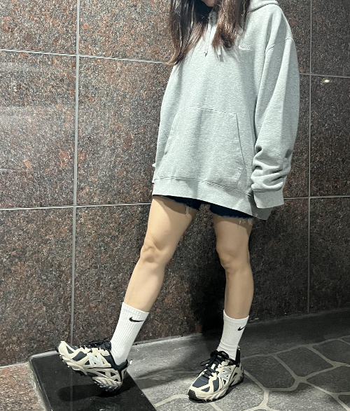 치마, 슬랙스 등 다양하게 매치할 수 있을 것 같은 운동화인데요. 저는 짧은 청바지와 후드를 입고