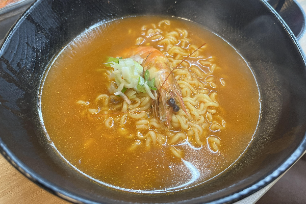 통새우 한마리가 들어간 새우라면입니다. 사진으로는 냄새가 전해지지 않아서 아쉽네요. 시원한 라면국물이 입맛을 돋궈주었어요. 파가 들어가 있어서 시원~ 합니다. 같이 간 동생과 언니랑 무슨라면으로 끓였을까? 이야기를 나누어보았는데요. 진라면 매운맛?! 일 것 같다고 예상하였습니다.