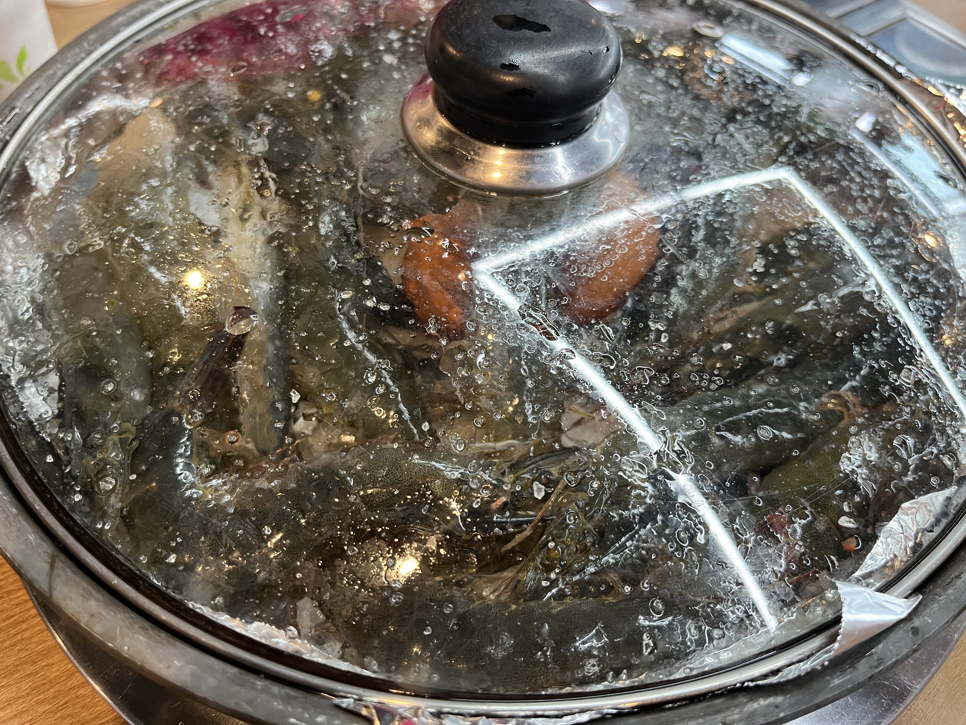 새우가 나왔습니다. 새우 소금 구이 냄비 안에는 달걀2개도 들어가져있습니다. 새우가 통통하고 싱싱합니다.