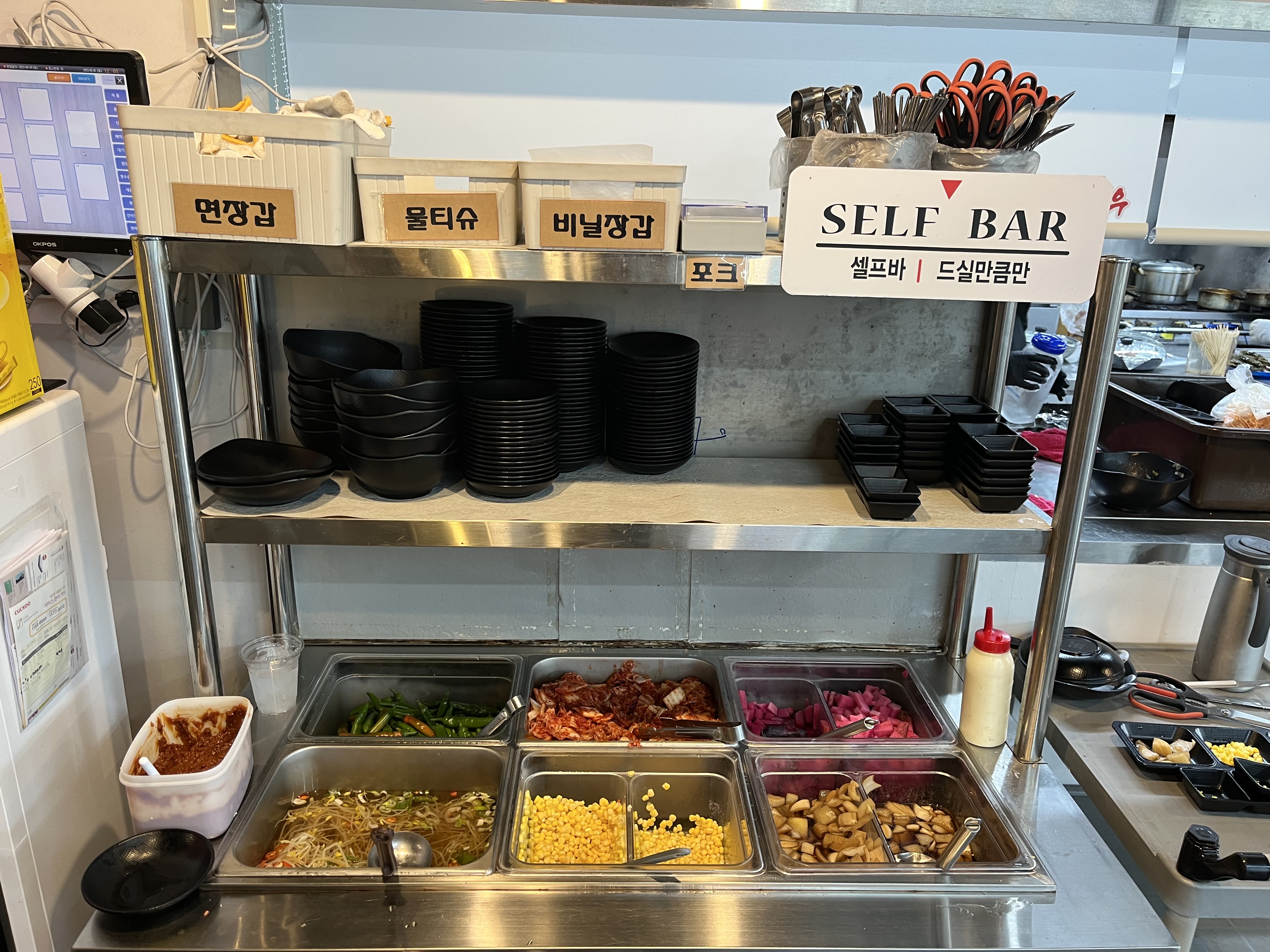 셀프바에는 각종 밑반찬이 준비되어있습니다. 그 외에도 면장갑, 물티슈, 비닐장갑이 준비되어있습니다.