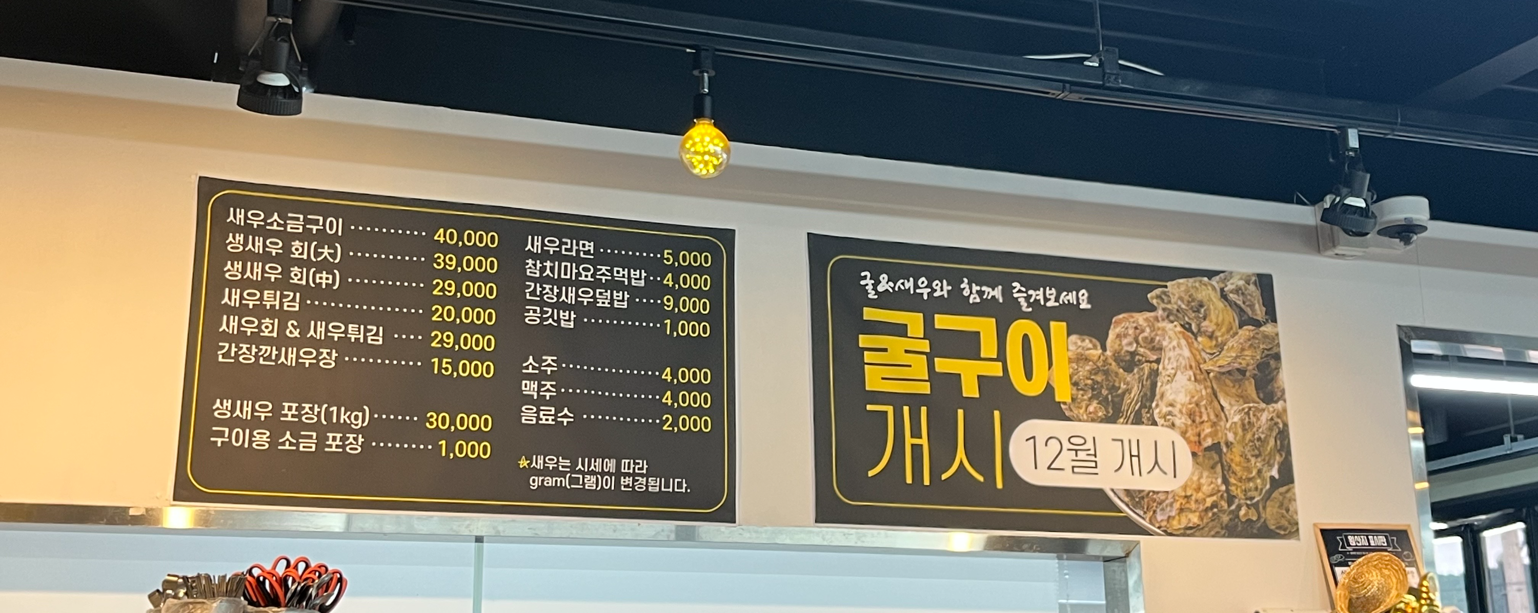 도시새우 메뉴판입니다. 새우는 시세에 따라 그램이 변경되는점 참고해주세요