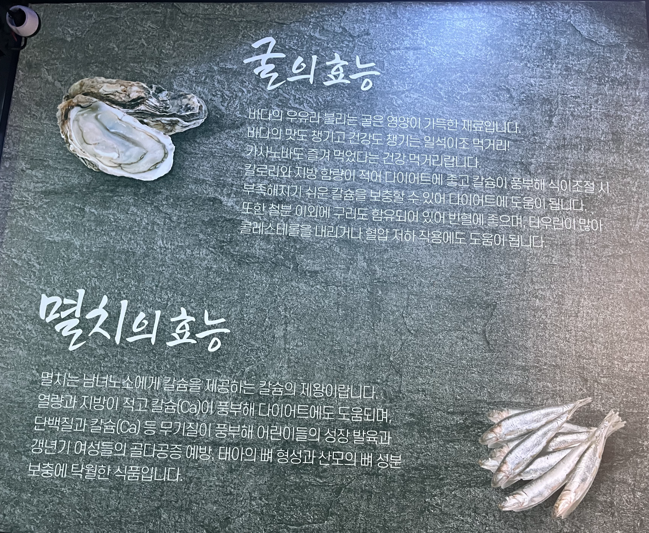 | 잠깐!!! '굴의 효능'이 궁금하시지 않으신가요? ㅎㅎ 바다의 우유라 불리는 굴은 영양이 가득하다고 합니다 칼로리와 지방함량이 적으며 칼슘이 풍부합니다. 또한 철분 이외에 구리도 함유되어 빈혈에도 좋고, 타우린이 많아서 피로회복과 콜레스테롤을 내리는 것에도 좋다고 합니다. 가족들은 웃으며 스테미너에 좋다고 먹으라고 권하기도 했답니다 ㅋㅋ |