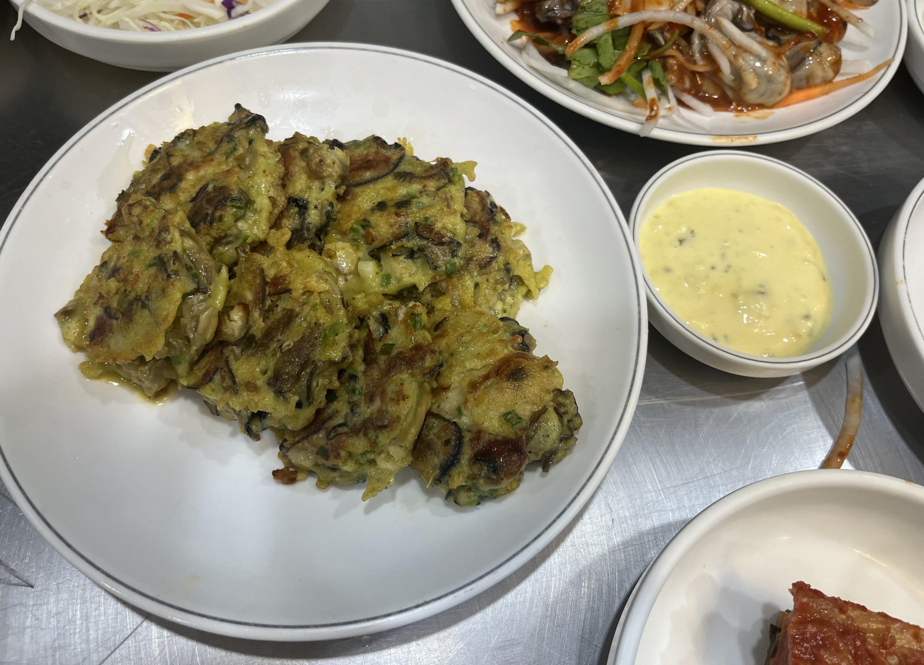 굴전입니다. 명절에 먹을 비주얼이네요. 굴 전은 옆에 노란 소스와 찍어먹습니다.
