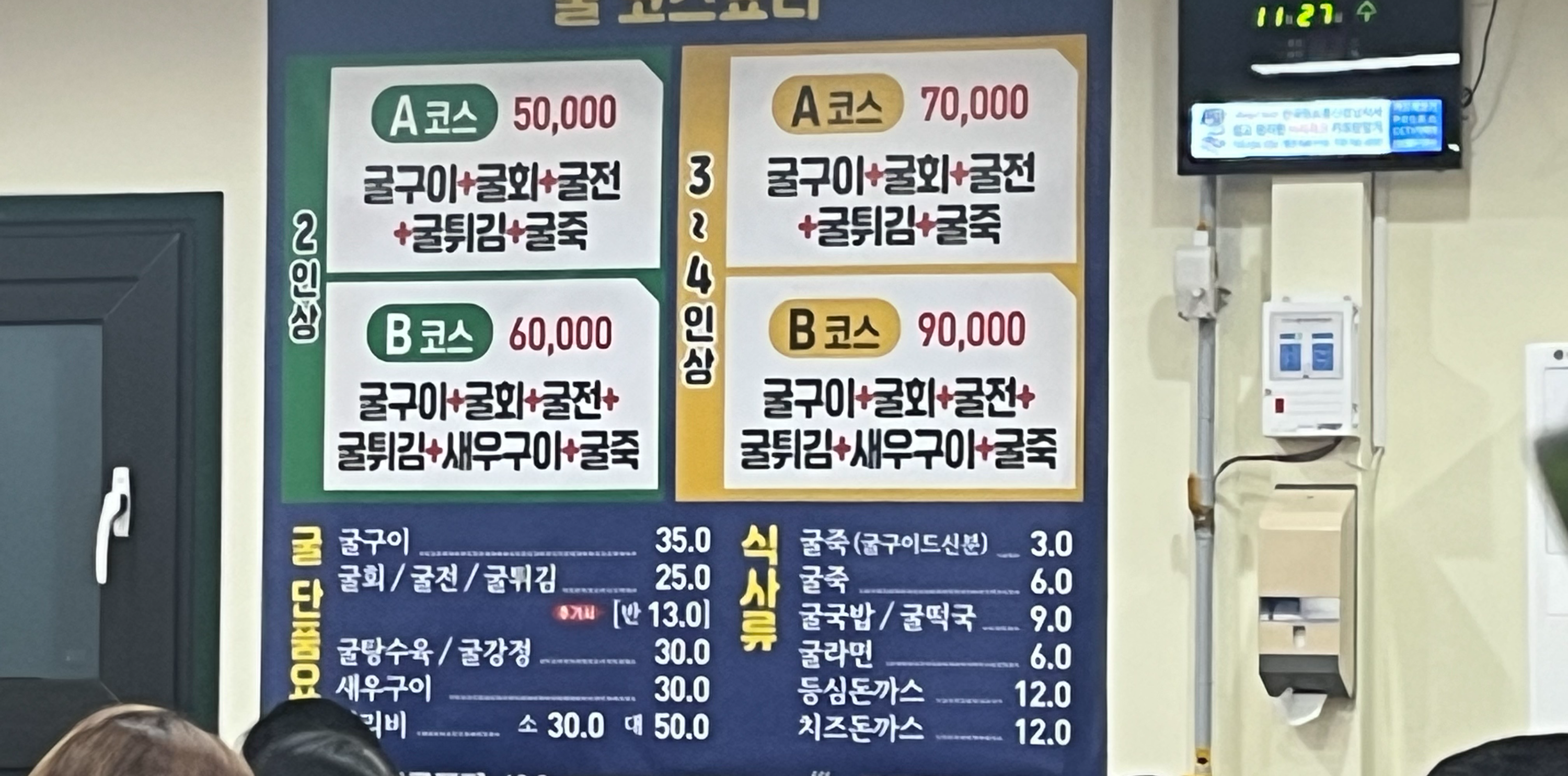 B코스는 굴구이, 굴회 , 굴전, 굴튀김, 새우구이, 굴죽 으로 메뉴가 구성되어있습니다.