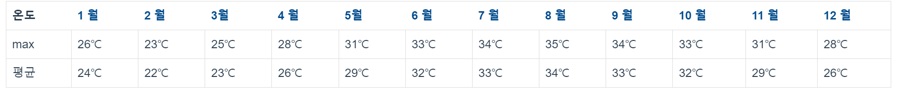 매우매우 덥습니다. 긴팔, 긴바지를 준비하신다면 아주 얇은 소재로 준비하세요.