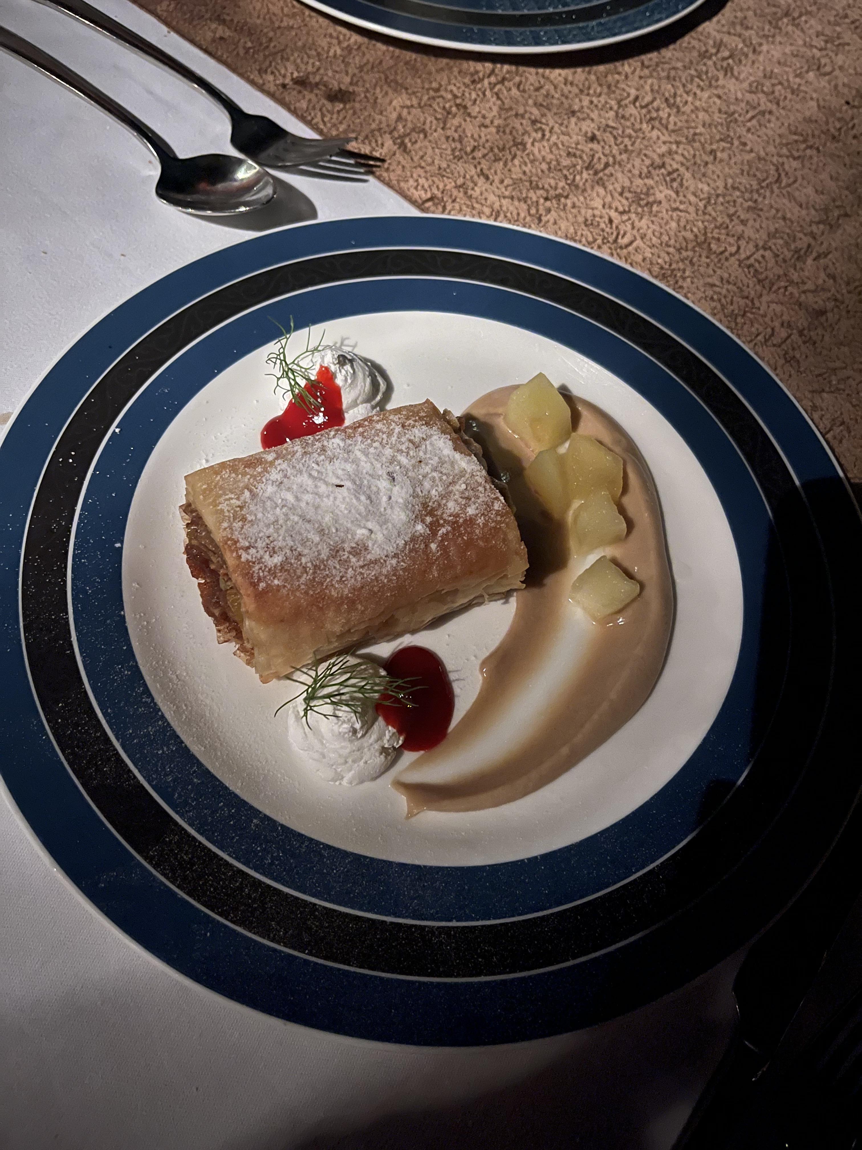 디저트로는 왼쪽사진인 Pecan nut fudge brownie와 오른쪽 사진인 Cinnamon apple strudel, star anise,vanilla whipped cream을 먹었습니다.