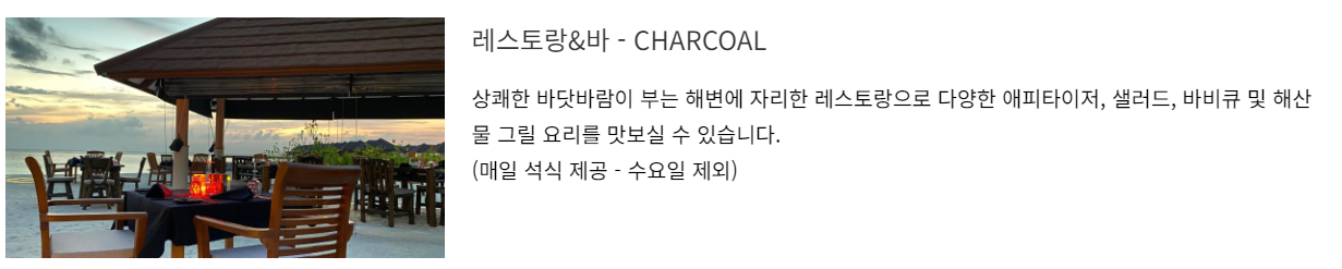 저희는 차콜과 누에서 저녁을 한번씩 먹었습니다. 그리고 라임앤칠리에서 하니문 특전으로 로맨틱 비치 디너를 먹었습니다.