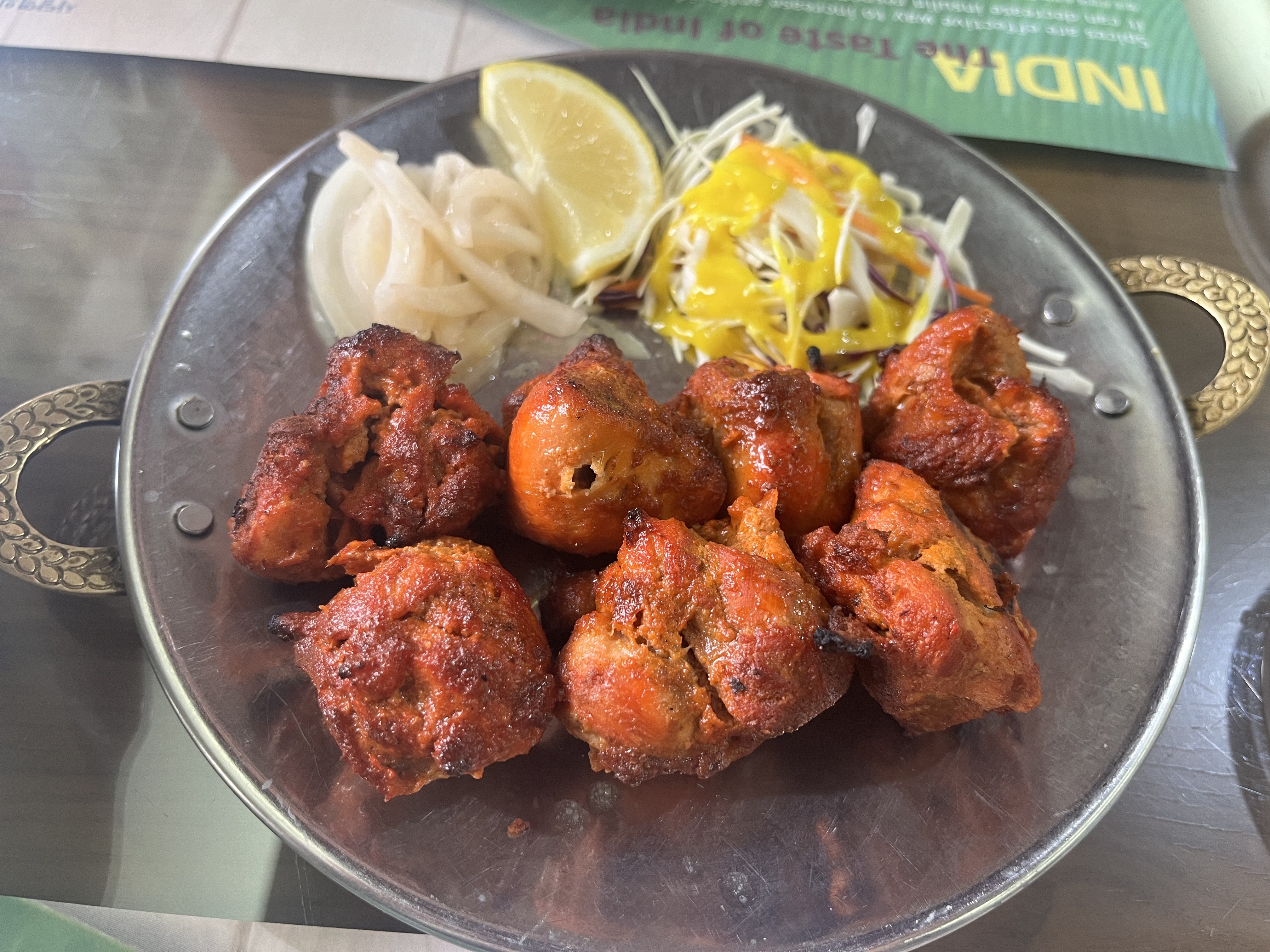 탄두리 치킨 요리 자체가 치킨이 퍽퍽한데, 퍽퍽한 치킨과 옆에 함께 나온 무채와 샐러드랑 먹으면 맛있습니다.