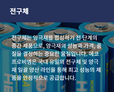 -양극재 원재료인 전구체, 리튬 등은 해외의존도가 높다. 전구체의 경우 90% 이상을 중국에서 수입한다. 에코프로비엠 모회사 에코프로에 따르면 양극재 판매가격이 킬로그램(kg) 당 20달러 수준으로 이 중 6달러만 에코프로에서 가져간다. 나머지는 중국 등 몫이다. 이를 에코프로는 자체 ‘양극재 생태계’를 만들기로 했다. 현재 에코프로는 경북 포항 영일만1일반산업단지에 배터리 리사이클 - 전구체 생산 - 양극재 제조 – 폐배터리 회수의 양극재 전주기를 총괄하는 캠퍼스를 구축하고 있다.