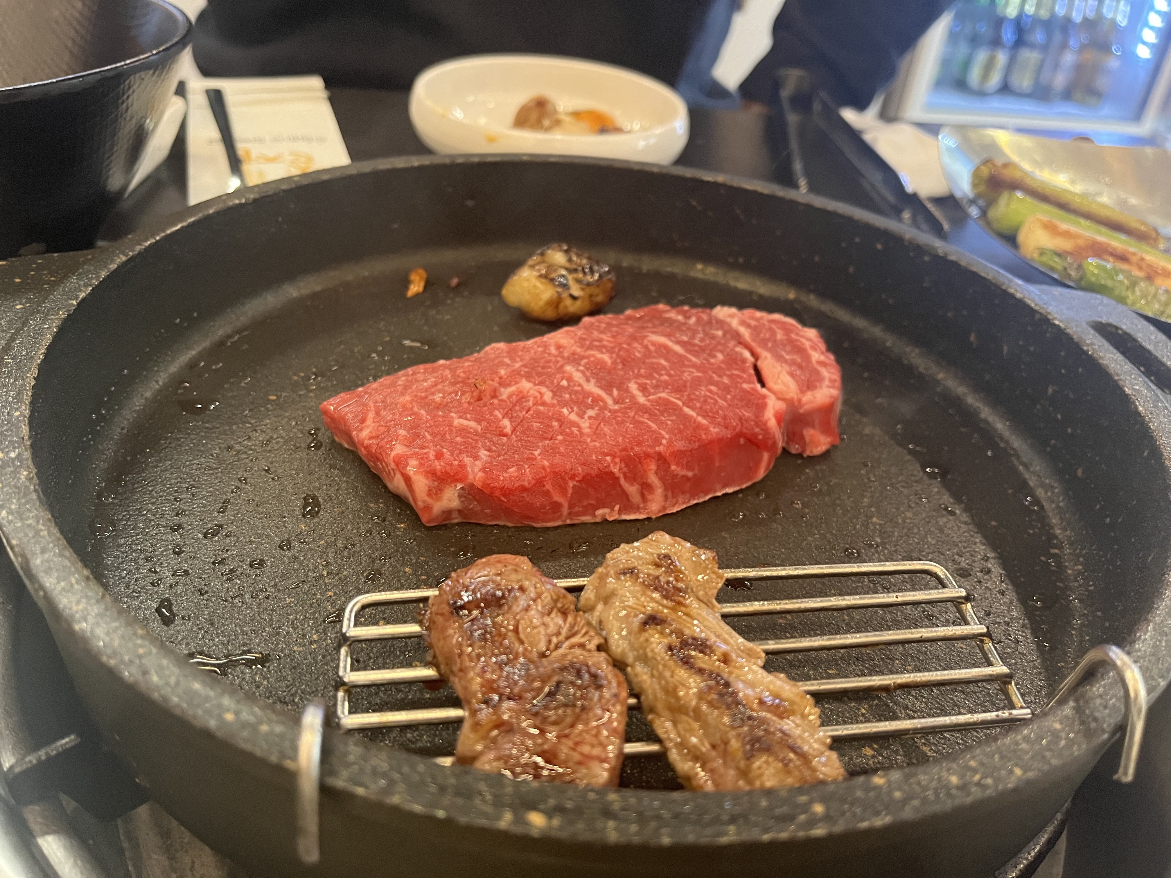 이곳만의 독특한 된장이었는데요. 소고기를 먹던 불판을 닦아 낸뒤에 그 안에 된장을 끓여주는 방식이었습니다.