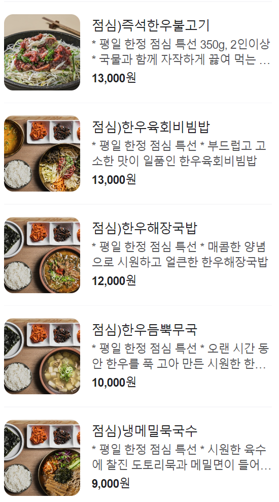 소고기메뉴, 점심특선메뉴, 식사메뉴, 기타메뉴 등이 있습니다.
