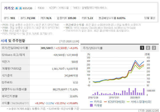 2020년 3월 급락시장이후 카카오 주가는 주당 134,000원에서 412,000원까지 놀랍도록 상승하였습니다.