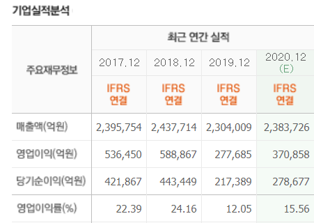 2017년, 2018년의 매출액은 거의 비슷하였으며, 영업이익률은 소폭 상승했다. 이는 원가관리를 신경썼다는 것을 보여준다. 2019년도에는 매출액은 상승하였으나 영업이이률은 더 떨어진 것을 볼 수있다. 이는 결국 원가 비중이 높다는 것을 보여준다. 또한 삼성전자와 비교했을 때 영업이익률이 상당히 낮다. 이 또한 원가의 비중이 높기때문으로 해석된다.