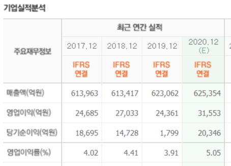 2019년에는 매출액이 2017년도의 매출액보다 소폭줄었으나, 영업이익률은 더 하락한 것으로 보아 원가관리가 부족했음을 알 수 있다.