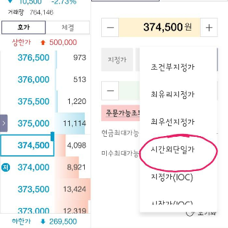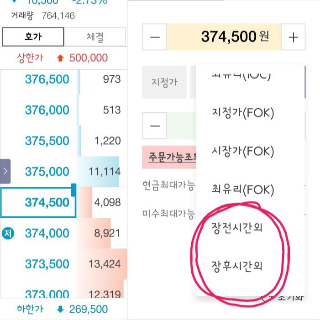 기타주문을 눌러보면, 시간외단일가, 장후시간거래, 장전시간거래가 있다.