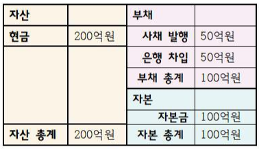 | 차입금, 사채, 매입채무, 미지급금, 선수금 등 | 자본금, 자본잉여금,이익잉여금 |