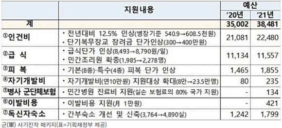 7종 패키지에는 인건비, 급식, 피복, 자기개발비, 병사 군단체보험, 이발비용, 독신자 숙소와 같이 7가지 항목에 대해 예산을 대폭늘려 군인들의 처우를 개선할 예정입니다.