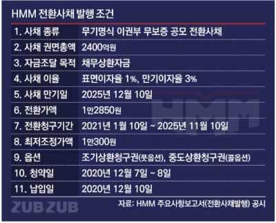 - HMM은 이미 발행한 전환사채, 신주인수권부사채 등 나중에 주식으로 바뀔 수 있는 채권이 3조5800억 원어치이다. HMM의 최대주주인 공적 기관(한국산업은행, 한국해양진흥공사)이 가지고 있으므로 채권을 주식으로 바꾸는 결정을 해도 최대주주 변경 가능성은 없다. 하지만 나중에 공적자금 회수 가능성이 있다.