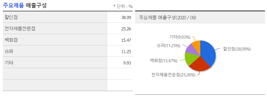 할인점과 전자제품전문점의 매출비중이 63.35를 차지한다.