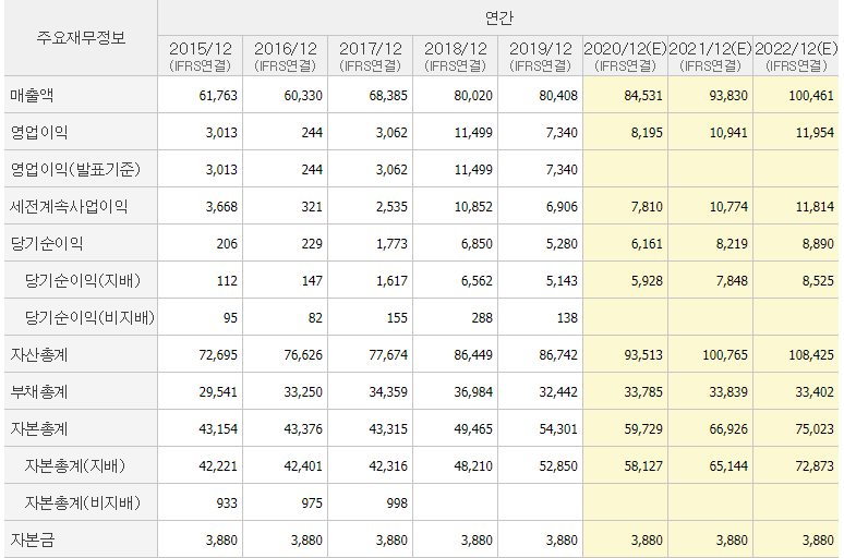매출이익과 순이익이 꾸준히 상승중이다. 부채비율은 2020년 기준 56%정도로 안정성이 좋다.