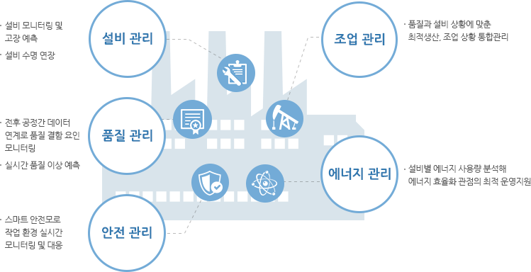 생산현장 데이터를 실시간 수집해 빅데이터 분석과 인공지능으로 최적의 제어를 지원한다. 이러한 시스켐은 제조업의 생산성 향상은 물론 품질 경쟁력을 제고하고 설비, 에너지, 안전 등의 관리 수준도 향상시켜 제조 경쟁력 높혀준다.