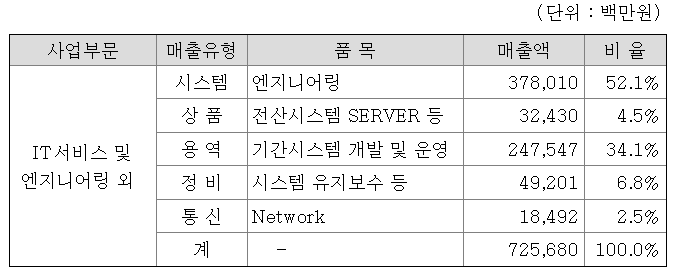 주 사업으로는 IT서비스, 시스템 엔지니어링이 있으며, 매출에서는 더욱 세분화 되어 시스템, 상품, 용역, 정비, 통신 으로 나뉜다.