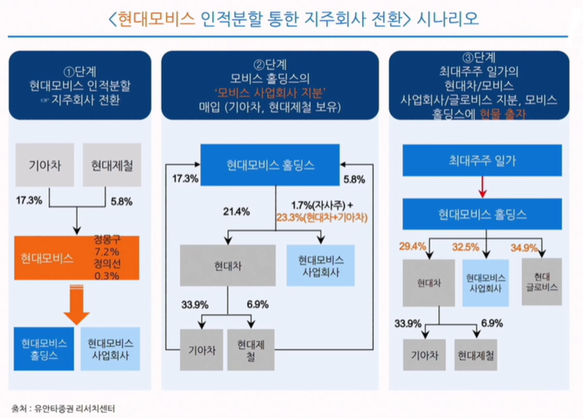 [ 현대모비스를 분할(현대홀딩스와 현대사업회사) → 정의선 회장이들고 있는 주식 현물출자(현대차, 글로비스) → 이렇게 분할된 현대모비스를 기아차, 현대차가 가지고 현대모비스 사업회사는 현대홀딩스가 사오고 → 정의선 회장은 현대모비스 홀딩스 주식을 사온다 ]